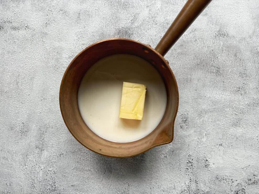 - Breng boter, water, melk en een snufje zout in een steelpannetje aan de kook.