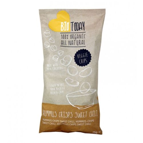 Hummus chips met sweet chili van BioToday in een zak van 75 gram. Lekker uit het vuistje of serveer de chips op een feestje.