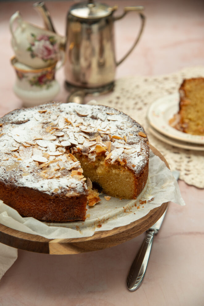 Deze smeuïge amandelcake is een echte traktatie: vol van smaak, rijk aan amandel en heerlijk zacht vanbinnen. De bovenkant is bedekt met een dun laagje geschaafde amandelen en suiker, dat tijdens het bakken licht krokant karamelliseert voor een fijne bite. De intense, lichtzure smaak van de amarenakersen vormt de perfecte tegenhanger van de zoete, notige cake — een onweerstaanbare combinatie die elke keer weer smaakt naar meer.