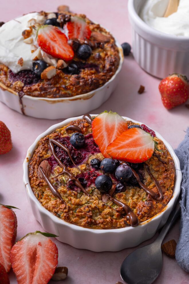 Baked oats vind ik net een ontbijttaartje! Zeker als je er een bananenbrood baked oats variant van maakt. En deze variant met rood fruit, knapperige amandelen en verstopte groente komt bij mij nog veel vaker op tafel!