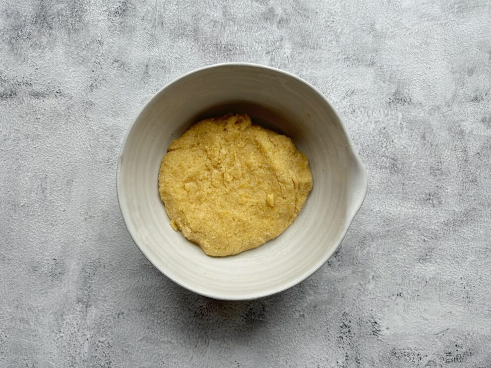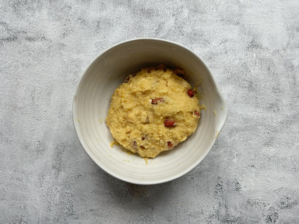 2. Meng alle ingrediënten voor het deeg (behalve de noten) door elkaar. Voeg eventueel een klein beetje water toe als het deeg te droog is om er een samenhangend geheel van te maken.