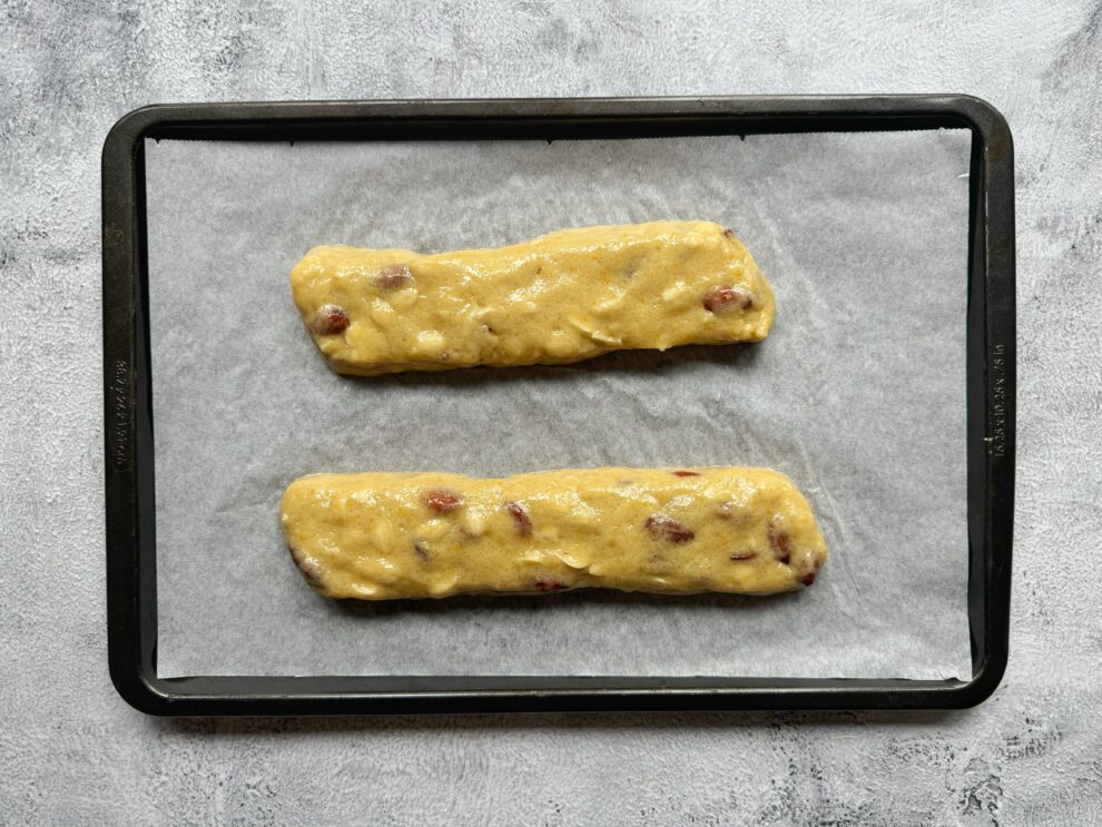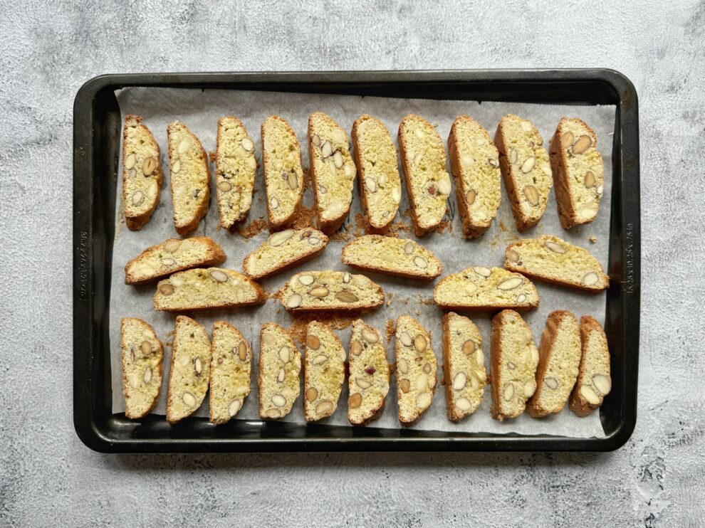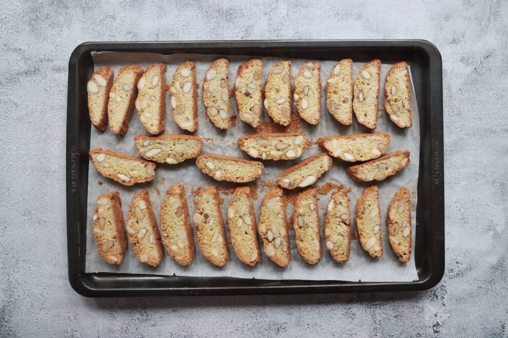 Biscotti betekent in het Italiaans “twee keer gebakken” en dat is precies waar deze koekjes hun naam aan te danken hebben. Eerst bakken we een soort broodjes van het deeg. Als het nog warm is snijden we het meteen in plakken en bakken we de plakken een tweede keer. Het resultaat is een hard koekje, traditioneel geserveerd na de maaltijd met een glas Vin Santo (Toscaanse dessertwijn) of koffie om het koekje in te dopen. Omdat de koekjes zo hard en droog zijn, zijn ze heel lang houdbaar. Dit maakt ze een geliefd cadeautje tijdens de feestdagen.