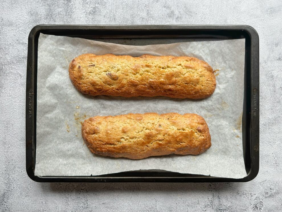 6. Laat ze maximaal een paar minuten afkoelen en snijd ze daarna met een broodmes in schuine plakken van 1 ½ cm dik. Leg de plakken op de snijkant op het bakpapier.