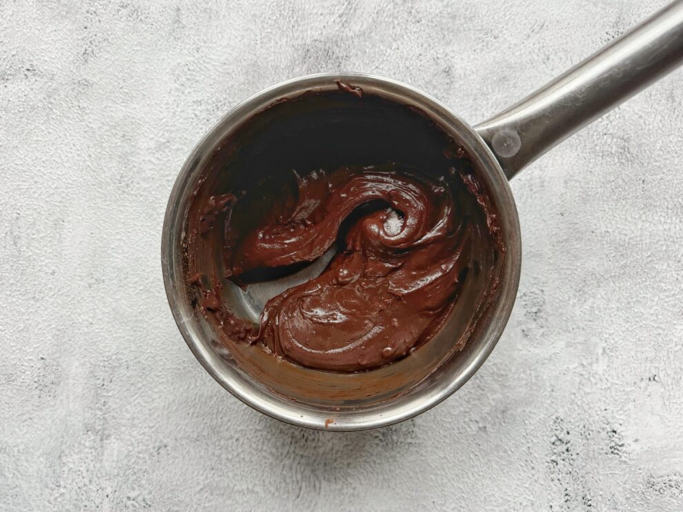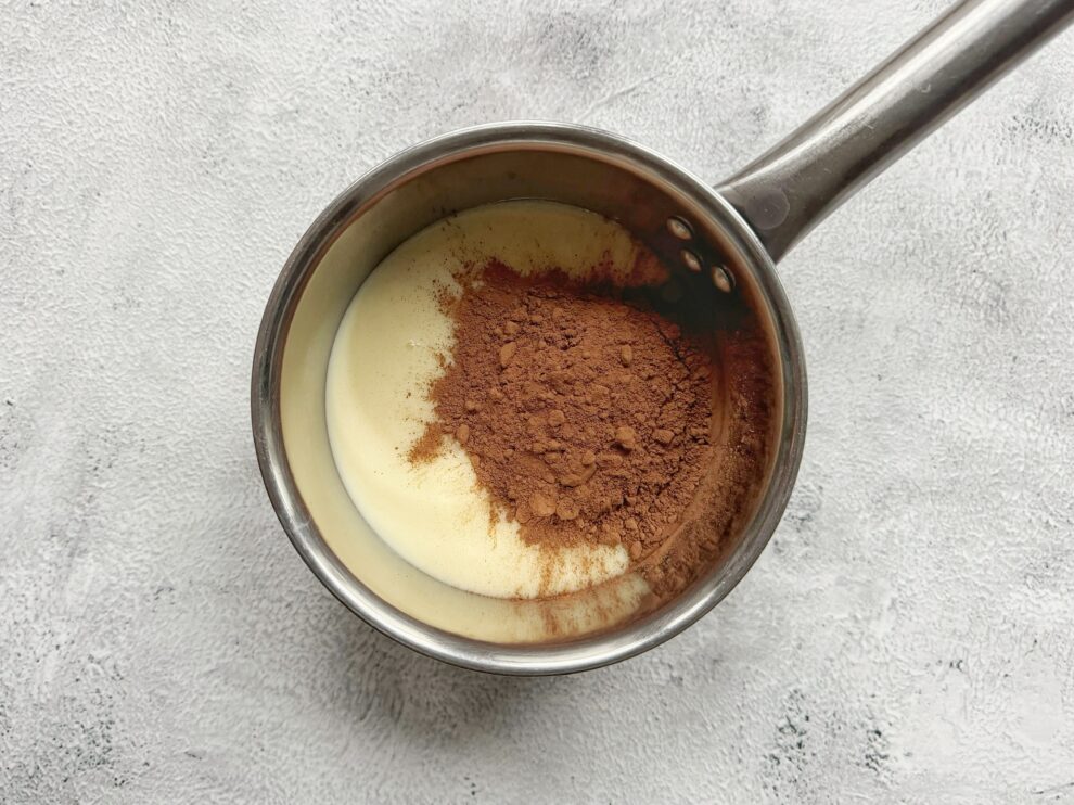 - Doe de gecondenseerde melk met de cacao en naar smaak een snufje zout in een steelpan. Roer dit met een spatel goed door elkaar voordat je het vuur aanzet om klontjes te voorkomen. Voeg daarna de boter toe.