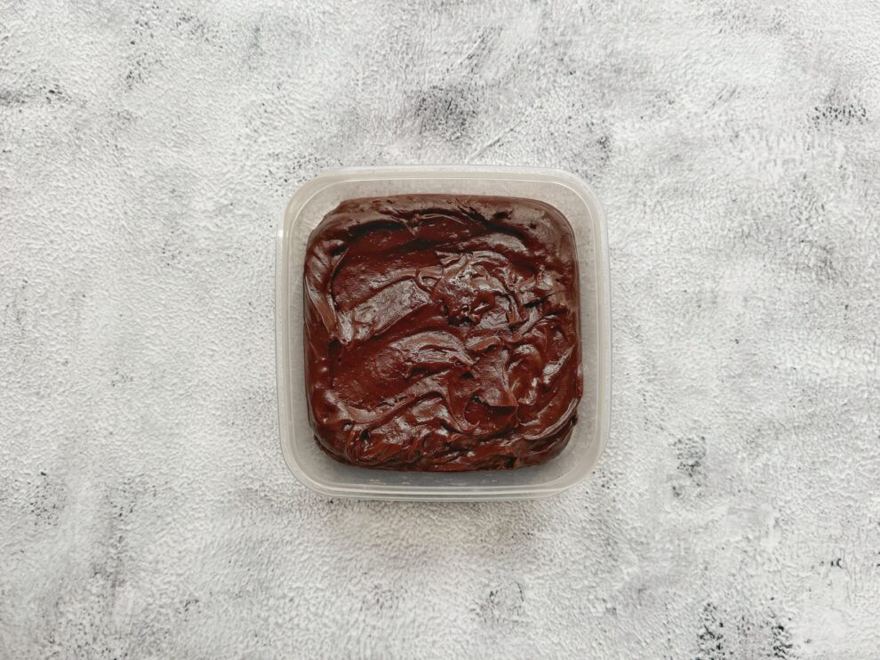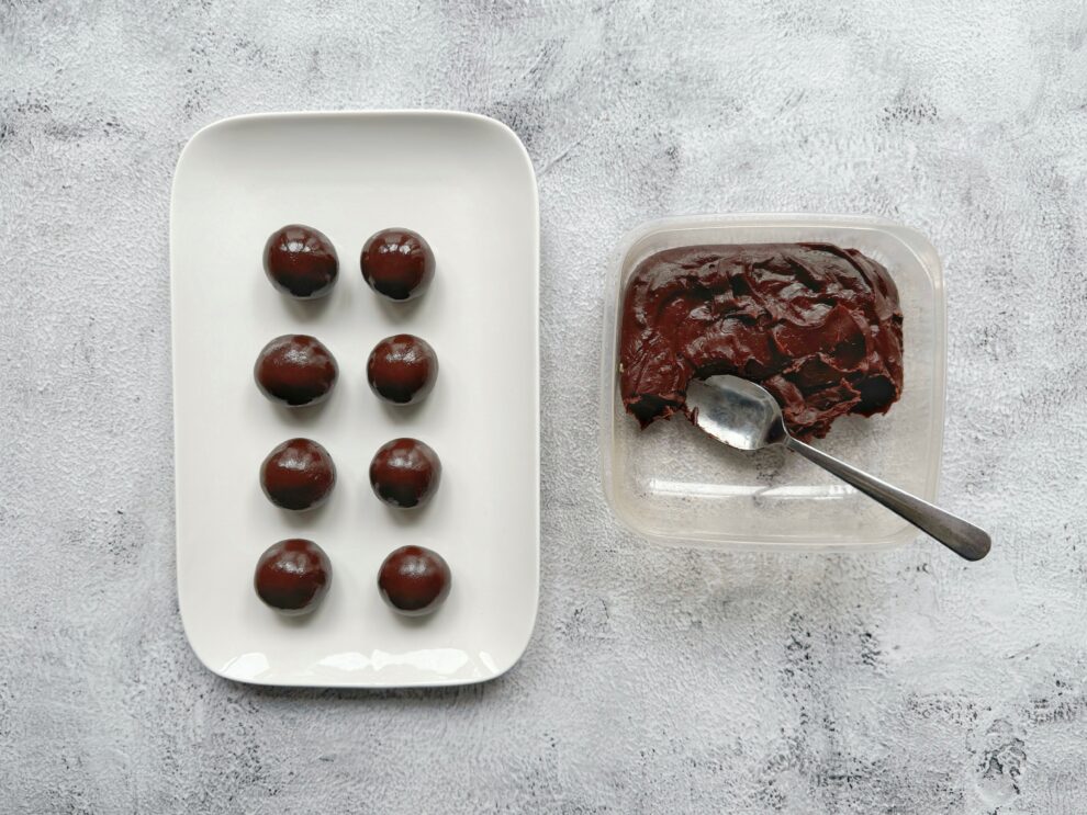 - Giet het warme mengsel in de ingevette schaal en laat het eerst even afkoelen op het aanrecht. Zet de schaal daarna een uurtje in de koelkast totdat de vulling stevig genoeg is om er balletjes van te rollen.