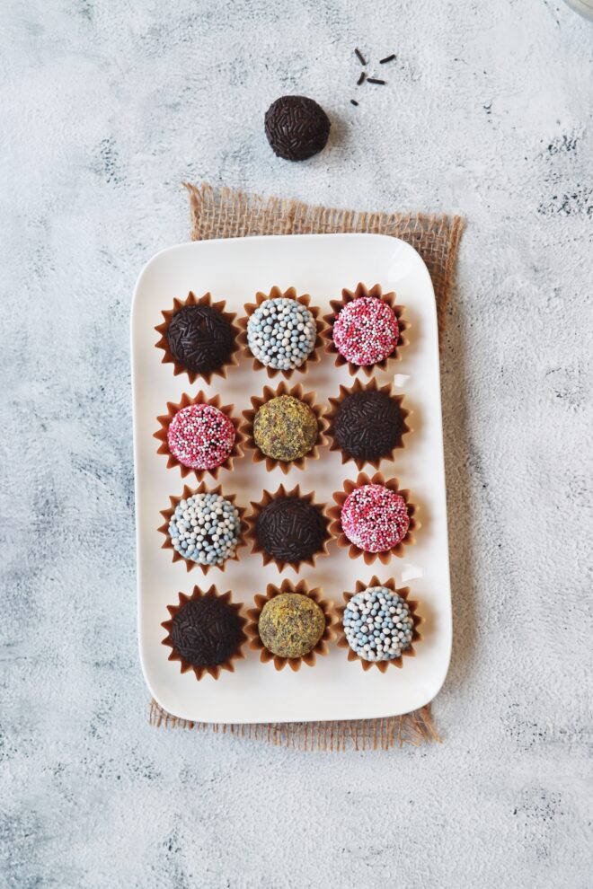 Naast de smaak van de vulling zelf kun je ook variëren met de buitenkant door de hagelslag te vervangen door andere toppings. Denk hierbij aan fijngehakte (pistache)nootjes voor een luxe uitstraling en een lekkere bite of gebruik gekleurde muisjes als je Brigadeiros maakt voor een babyshower. Als je zelfgemaakte Brigadeiros aan iemand cadeau wilt geven, dan kun je ze in kleine papieren vormpjes in een bonbondoosje presenteren.