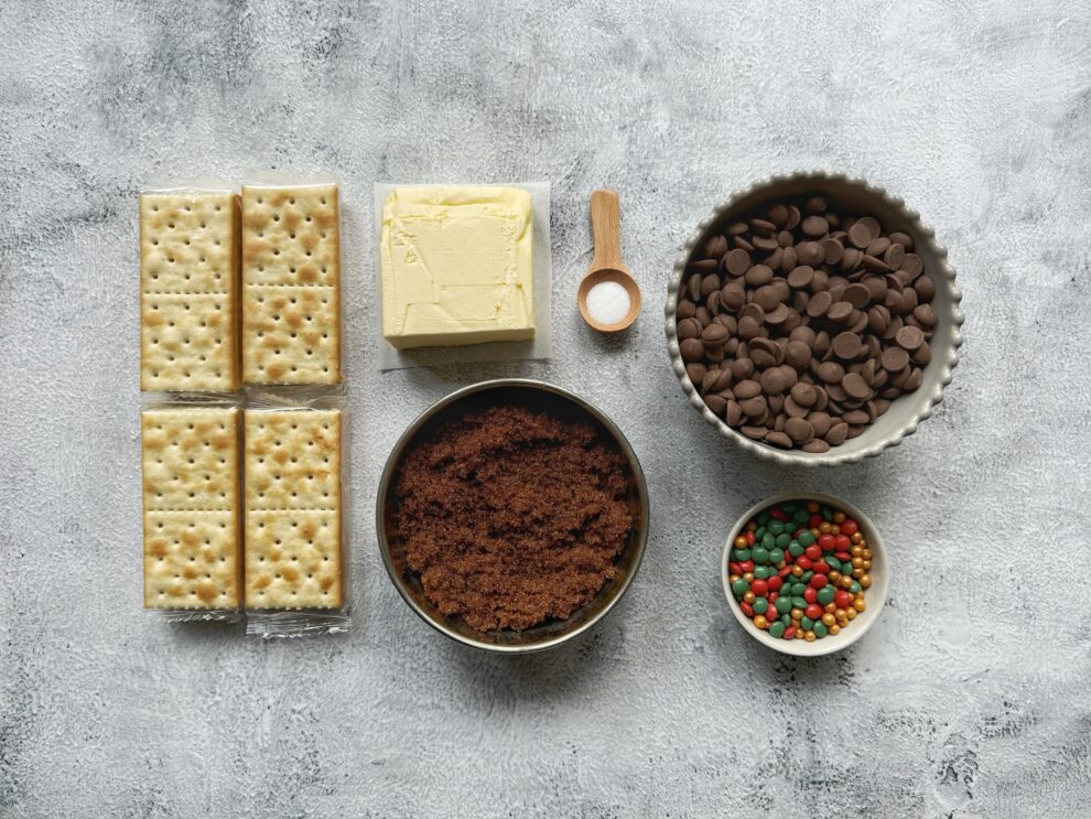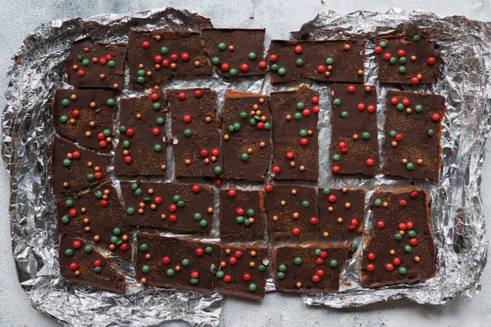 De basis bestaat uit een verassende laag mini crackers die je bedekt met de makkelijkste karamel ooit van boter en donkere basterdsuiker. Dit voorzien we van een laagje chocolade die je naar hartelust kunt versieren met kerstige toppings. Na het opstijven breek je de plaat in grove, rustieke stukken. Het resultaat is een heerlijke snack die perfect is voor bij de koffie, maar ook fantastisch staat op een feestelijke plank of leuk is om cadeau te geven in een mooi zakje.