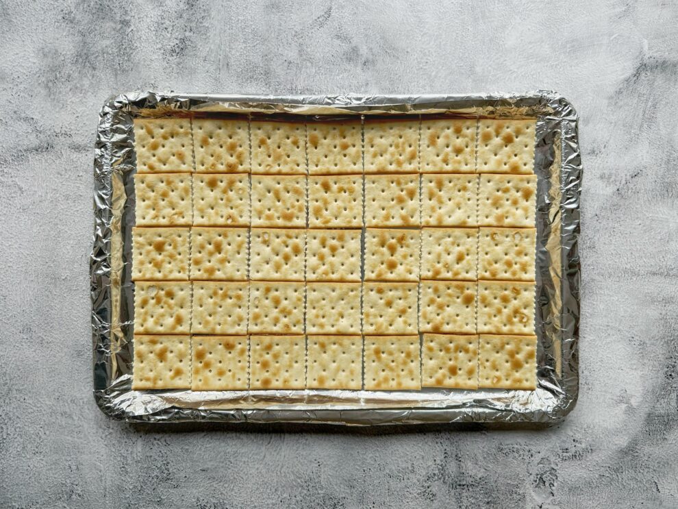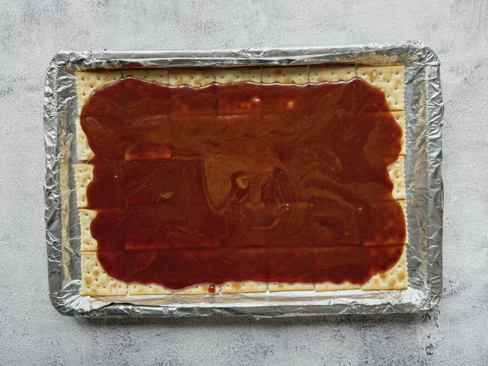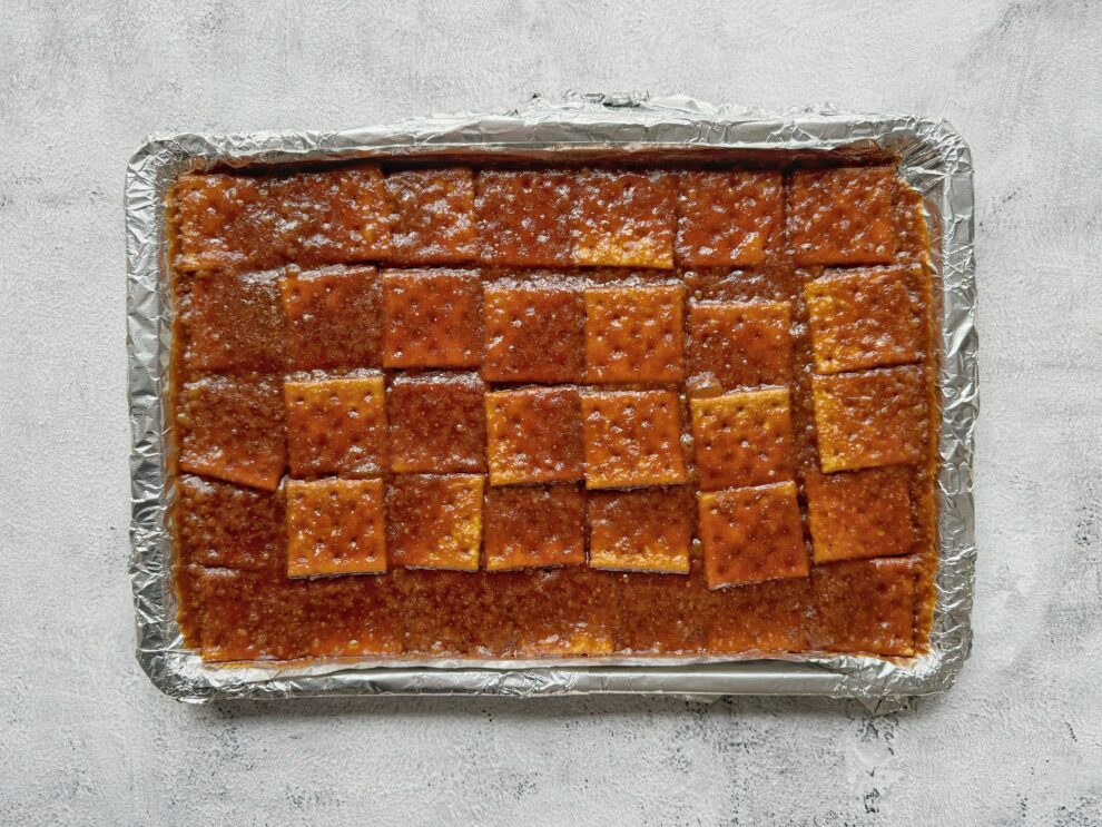- Giet de hete karamel op de bakplaat, bovenop de mini crackers. Gebruik de spatel om karamel te verdelen. Zet de bakplaat in het midden van de oven gedurende 6 minuten.
