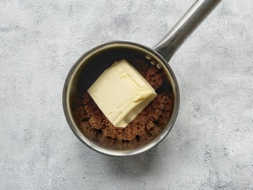 - Doe de boter met de donkere basterdsuiker in een steelpannetje en zet dit op middelhoog vuur. Roer regelmatig door met een spatel om aanbranden te voorkomen. Smelt intussen de chocolade au bain-marie of in korte intervallen in de magnetron (roer tussendoor steeds goed door!) en laat dit tot gebruik staan.