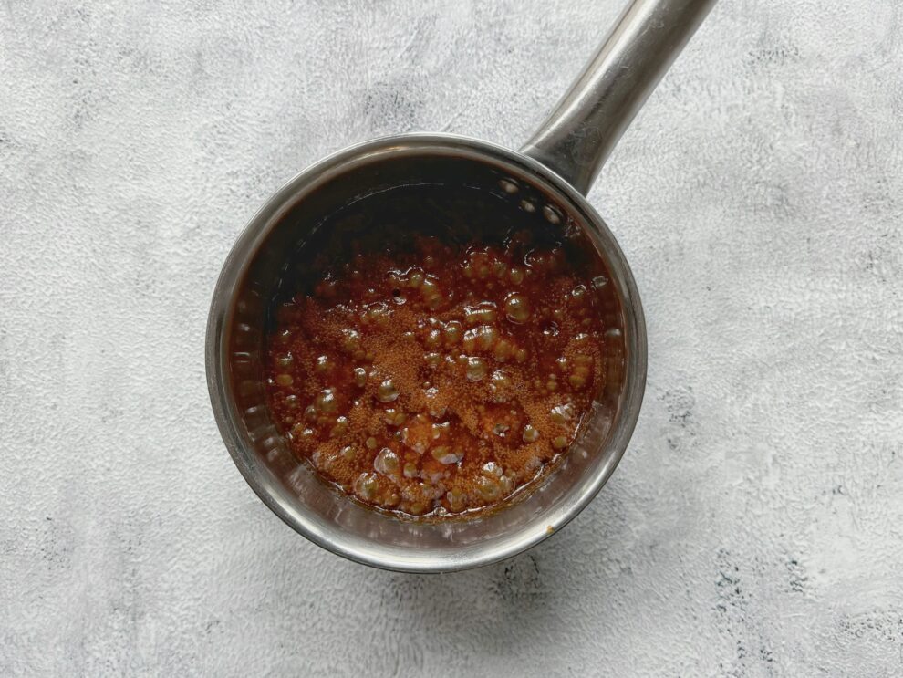 - Zet het vuur lager als de boter met de donkere basterdsuiker begint te koken. Laat het nog een paar minuten doorpruttelen tot de suiker helemaal opgelost is en de boter een beetje nootachtig ruikt. Het is nu karamel geworden.