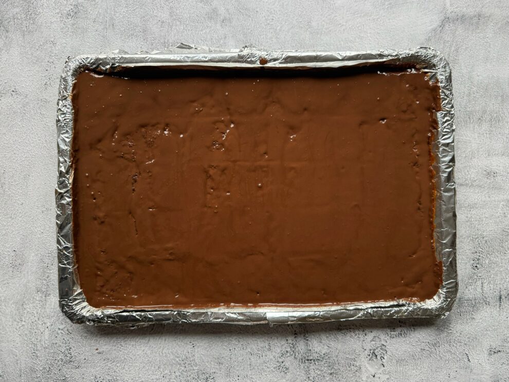 - Verdeel dan de gesmolten chocolade erover. Tik een paar keer met de bakplaat op het aanrecht om de chocolade mooi te laten uitvloeien.