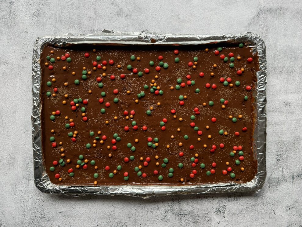 - Verdeel als de bakplaat niet meer heet aanvoelt toppings naar keuze over de chocolade, zoals groene en rode mini smarties, goudkleurige suiker en eetbare pareltjes. Zet de bakplaat 1 ½ uur in de koelkast zodat de karamel en de chocolade verder uit kunnen harden en breek de Christmas Crack daarna in stukken.