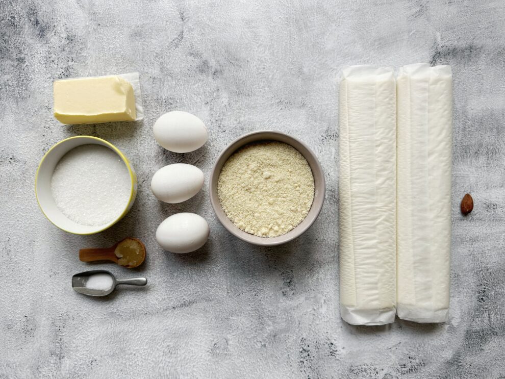 - Klop de boter met de suiker, citroenrasp en een snufje zout goed door elkaar. Klop dan eerst de 2 hele eieren en daarna het amandelmeel er doorheen.