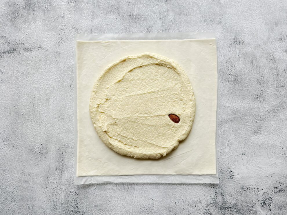 - Rol een van de twee rollen bladerdeeg uit. Leg het bladerdeeg met het bijgeleverde bakpapier op een bakplaat. Verdeel de vulling in een cirkel van 22 cm over het bladerdeeg. Dit gaat het makkelijkste door de vulling in een spuitzak te doen, maar met twee lepels gaat het ook. Druk een hele amandel of boon in de vulling. Bestrijk het bladerdeeg rondom de vulling licht met water.
