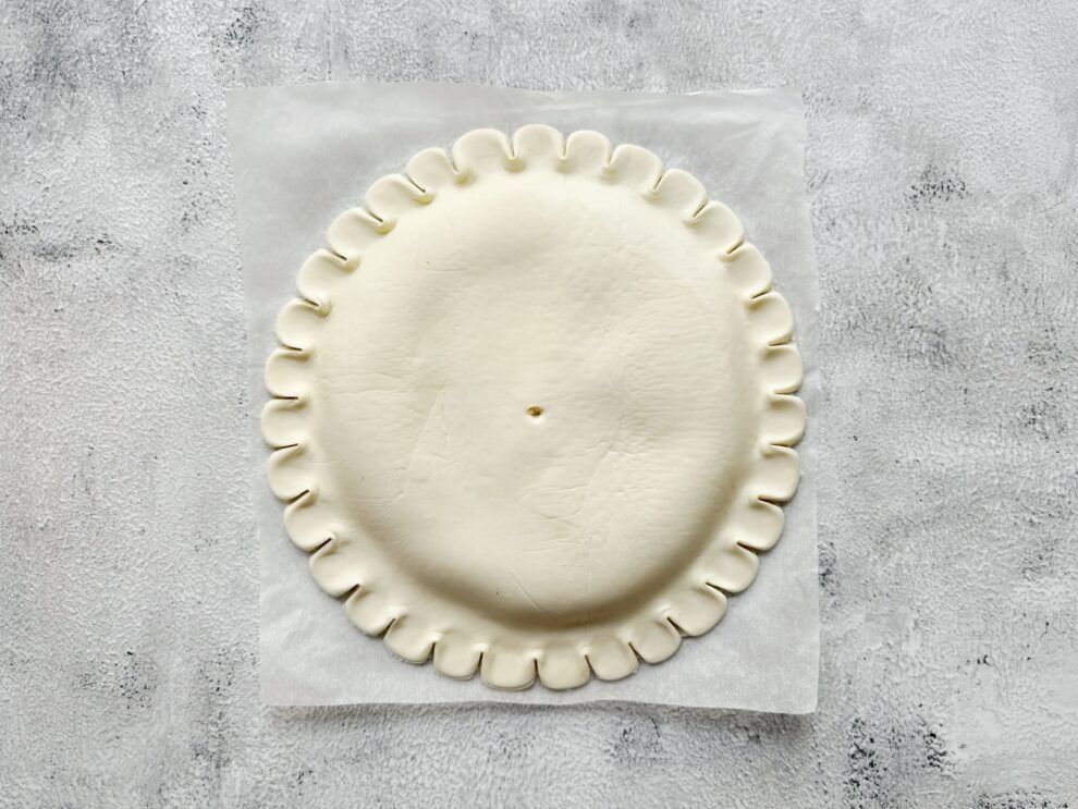 - Rol de tweede rol bladerdeeg uit en maak hem een paar centimeter breder door er zachtjes met een deegroller overheen te rollen. Dek de vulling af met het tweede vel bladerdeeg. Druk het deeg rondom de vulling goed aan om te zorgen dat het deeg goed aan elkaar plakt en er geen lucht tussen de vulling en het bladerdeeg zit. Gebruik een ronde uitsteker van 24 cm of een groot bord en een mesje om het bladerdeeg rondom weg te snijden. Maak naar wens met behulp van de achterkant van een vork of lepel en twee vingers een mooie geschulpte rand. Prik met een cocktailprikker een gat in het midden van de bovenkant van de taart zodat stoom kan ontsnappen tijdens het bakken.