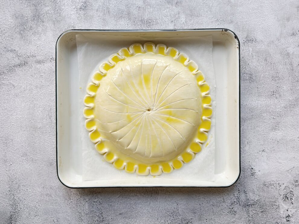 - Klop de eidooier los en bestrijk de bovenkant van de taart hiermee. Kerf daarna met een scherp mesje een mooi patroon in het bladerdeeg.