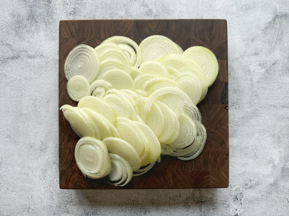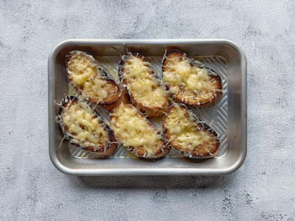 Tip: Overgebleven stokbrood of stevig (zuurdesem)brood van de vorige dag is perfect om in dit recept een tweede kans te geven. Als het brood wat droger is behoudt het namelijk goed zijn vorm, terwijl het alle smaken van de uiensoep in zich opneemt.