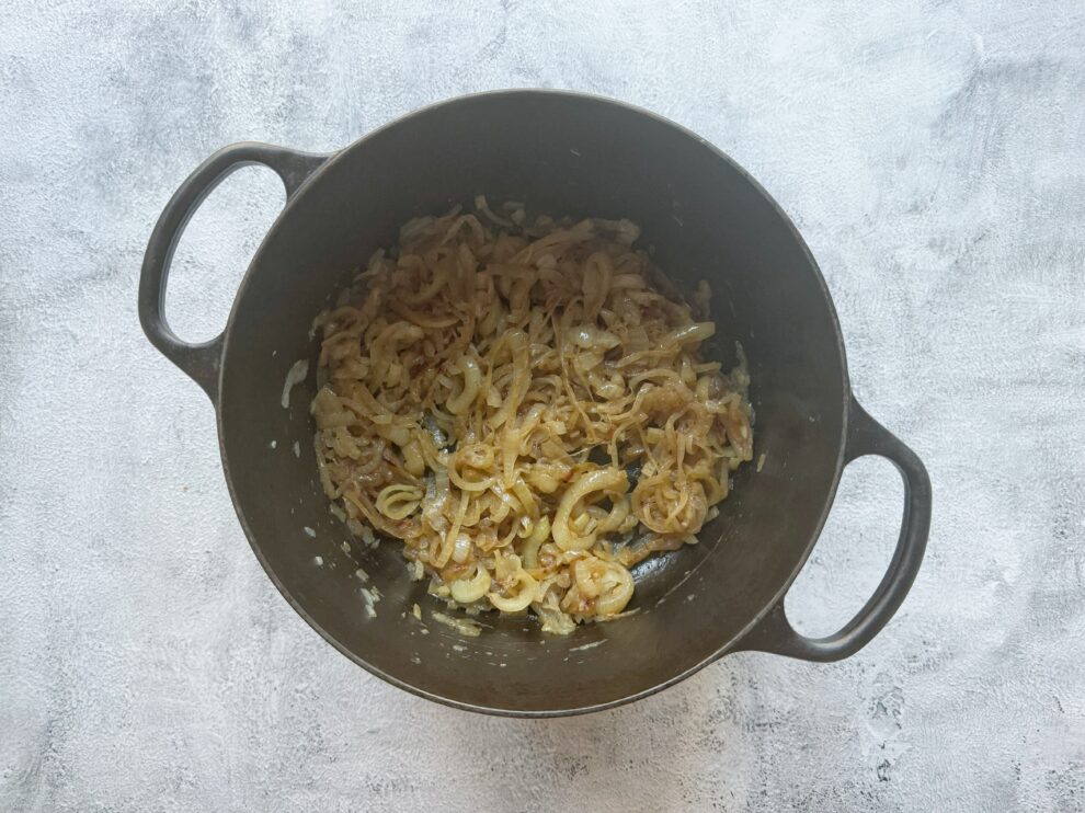 4. Optioneel: Blus de gebakken uien af met witte wijn.