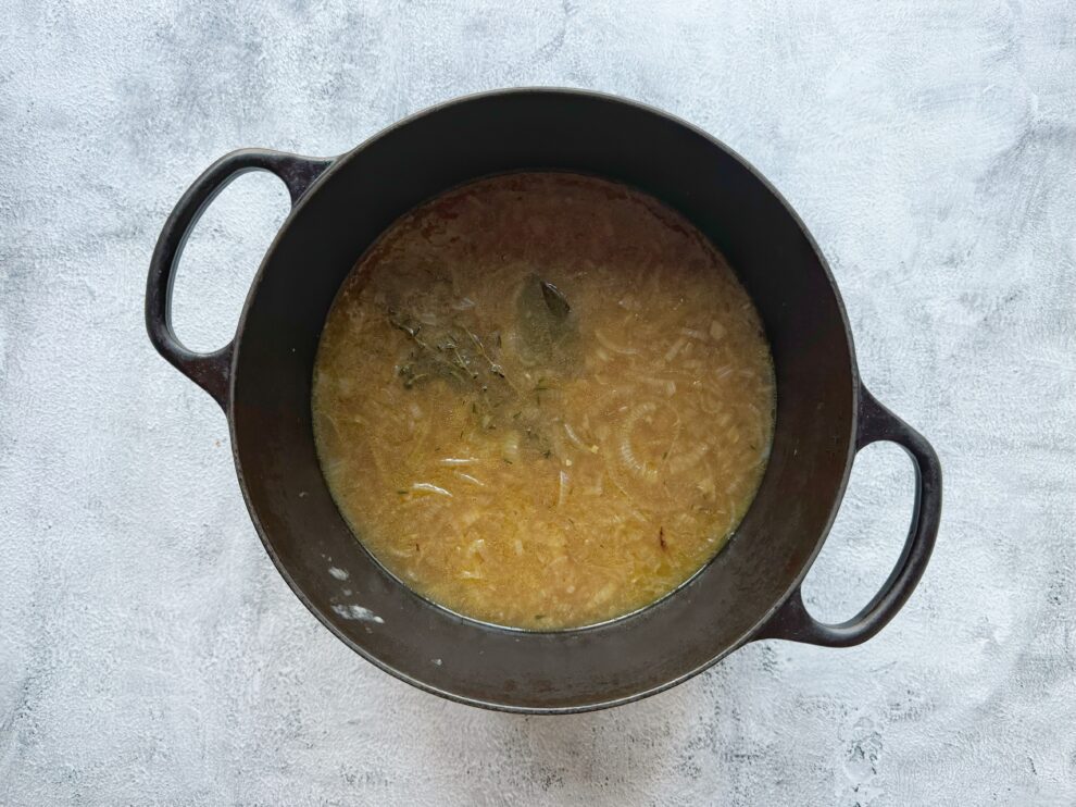 Voeg de bloem toe en roer samen met de aanbaksels los. Laat de bloem een paar minuten garen. Verwarm intussen de bouillon. Voeg de warme bouillon toe aan de gebakken uien. Breng de soep naar wens verder op smaak met een scheutje madeira of cognac (optioneel), een laurierblaadje en (gedroogde) tijm. Laat de soep 10 tot 30 minuten rustig koken. Proef en voeg naar smaak nog wat versgemalen zwarte peper en zout toe.