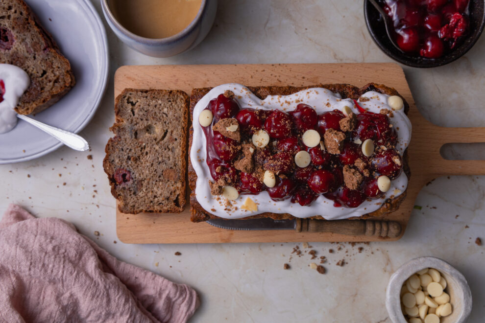 - Voor de topping schep je de kokosyoghurt over de cake heen en verdeel je daar nog wat extra kersen overheen. Als extra kan je nog wat meer witte chocolade en speculaasjes eroverheen verbrokkelen!