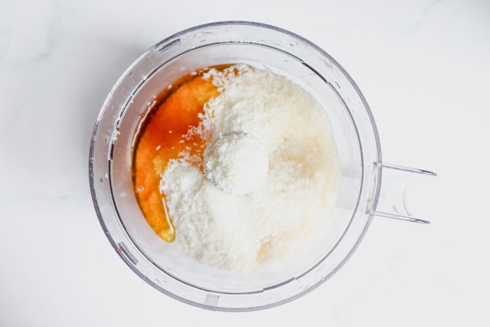 - Meng in een kom of keukenmachine de kokosrasp, gesmolten kokosolie en honing (of agave). Roer goed tot het mengsel vochtig en licht plakkerig is.