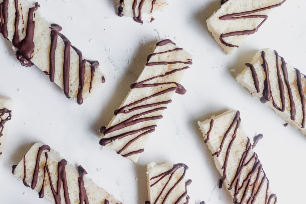 5. Haal de kokosbasis uit de vriezer en snijd in repen. Doop elke reep in de gesmolten chocolade of giet eroverheen met een lepel. Leg de repen terug op bakpapier.