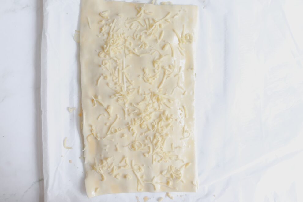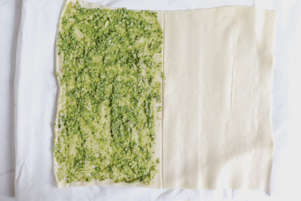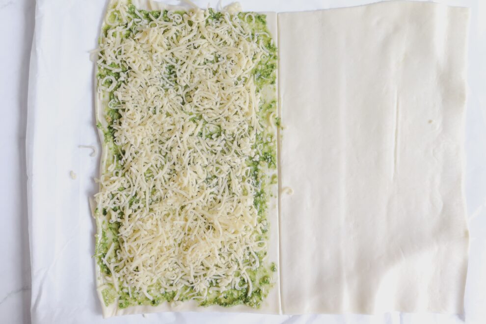 - Rol het bladerdeeg uit en bestrijk de helft van de plak met pesto. Strooi er royaal geraspte kaas overheen.