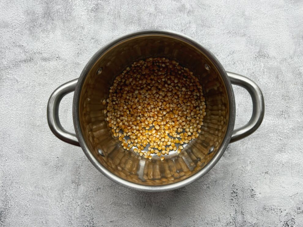 2. Doe de olie in een pan waarbij de mais de bodem van de pan volledig bedekt.