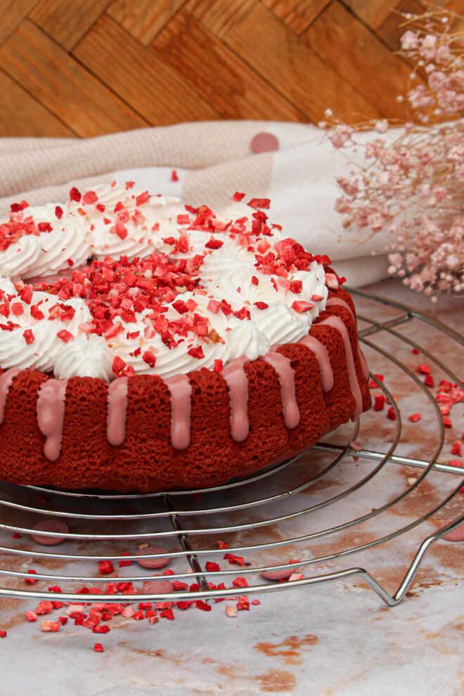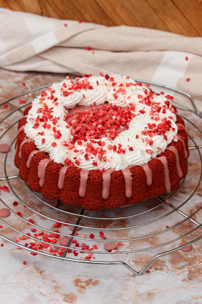 Een feestelijke Red Velvet tulband, rijkelijk afgewerkt met marshmallow botercrème. Onweerstaanbaar zacht, romig en spectaculair om te zien!