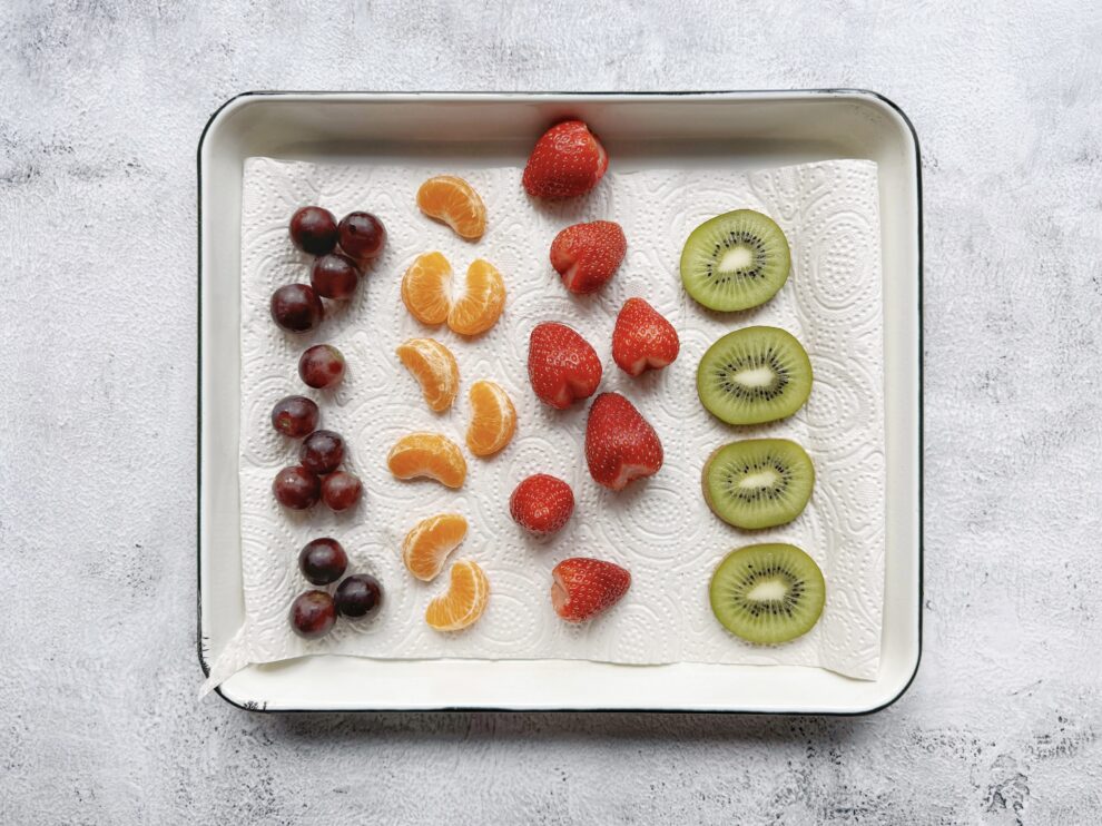 - Was het fruit en verwijder bij aardbeien de kroontjes. Dep het fruit zorgvuldig droog met keukenpapier (als het fruit nog vochtig is zal de suikerlaag niet hechten en zacht blijven).
