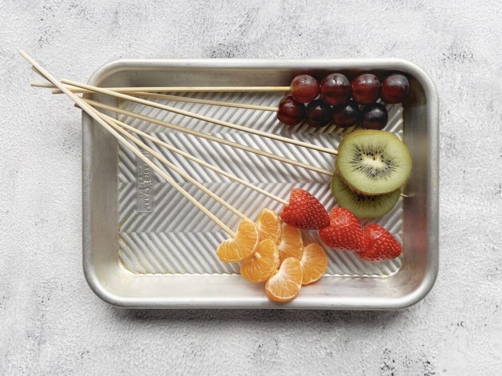 - Rijg het fruit aan satéprikkers. Zorg ervoor dat de punt van de prikker niet helemaal door het bovenste stukje fruit heen steekt.