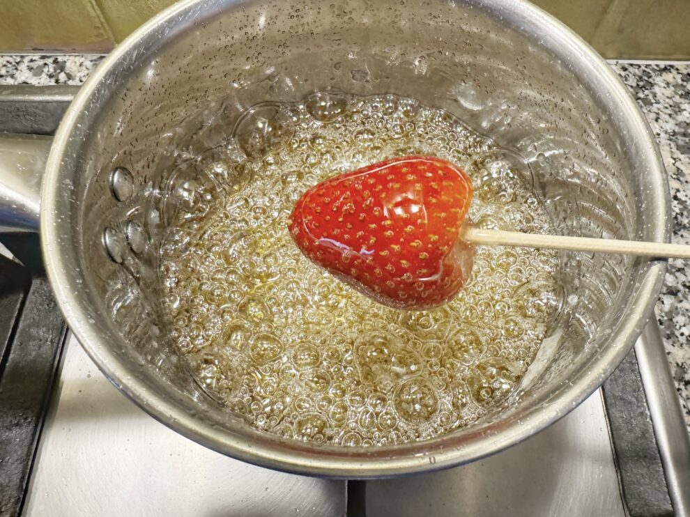 - Kantel de pan voorzichtig zodat de siroop zich aan één kant verzamelt. Haal een spiesje met fruit snel door de borrelende siroop en draai het rond zodat het fruit rondom bedekt wordt met een dun laagje suikersiroop.