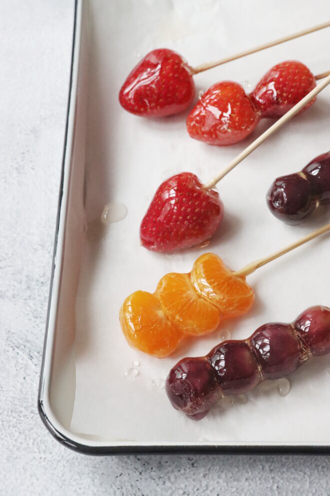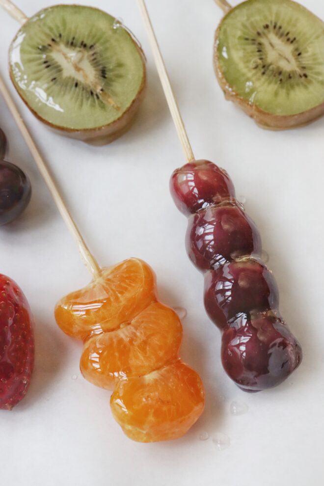 Hoewel de klassieke Tanghulu in China traditioneel met zure meidoornbessen wordt gemaakt, zijn aardbeien in andere landen als alternatief de onbetwiste favoriet. Daarnaast leent dit recept zich uitstekend voor allerlei andere fruitsoorten, zolang ze maar niet te vochtig zijn aan de buitenkant. Denk bijvoorbeeld aan druiven, partjes mandarijn, blauwe bessen of zelfs kiwi voor een kleurrijke variatie. Zorg er bij gesneden fruit wel voor dat het snijvlak goed droog is.