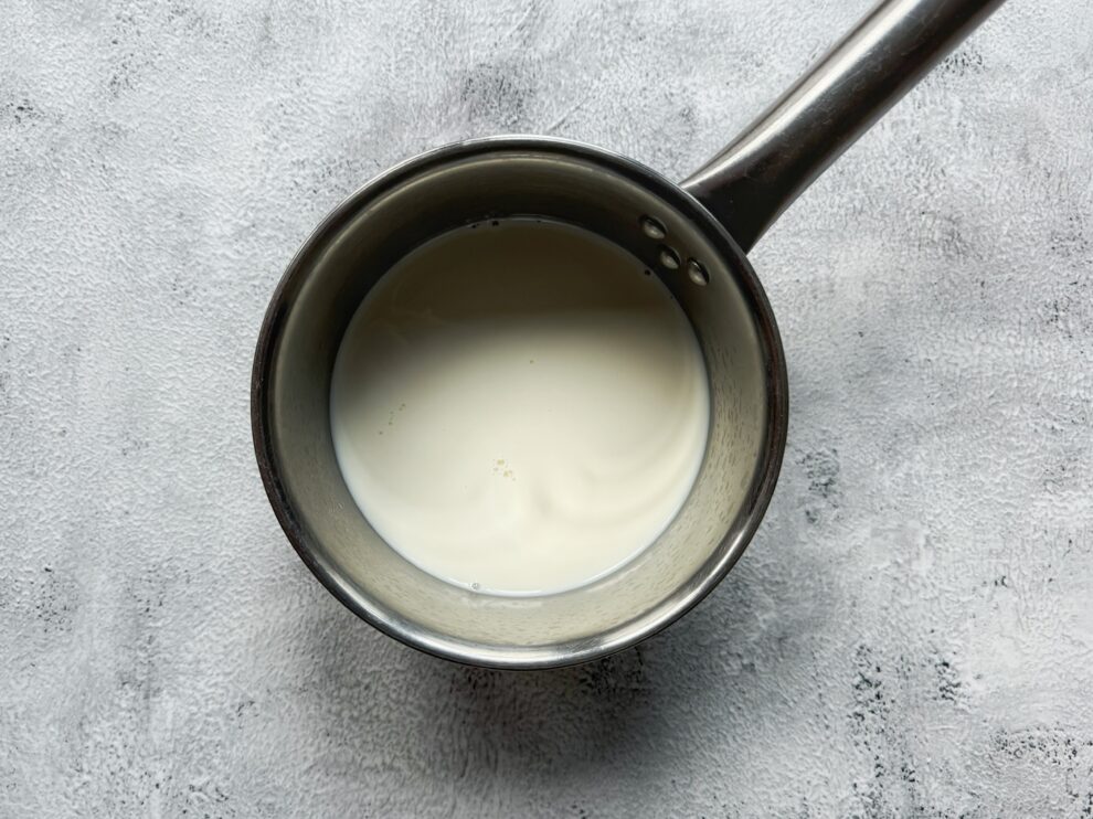 2. Giet de melk in een steelpannetje en breng op middelhoog vuur tegen de kook aan. Roer regelmatig door met een spatel of garde of velvorming te voorkomen.