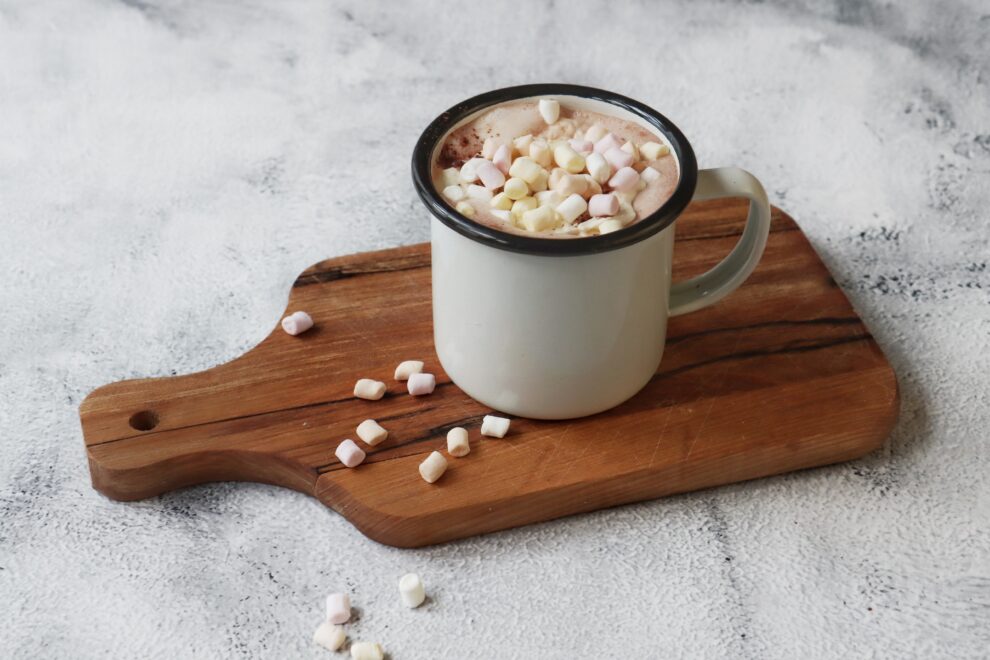 5. Maak naar wens af met verse slagroom, cacao en mini marshmallows. Geniet van je zelfgemaakte warme chocolademelk!