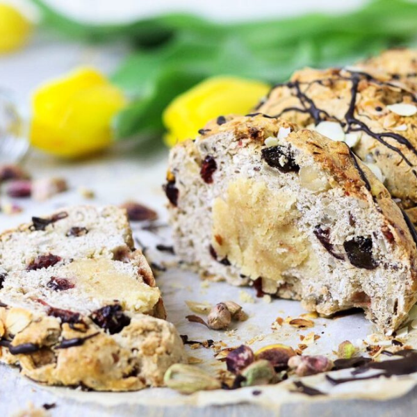Zelfgemaakt paasbrood met amandelspijs, pistache en speculaaskruiden